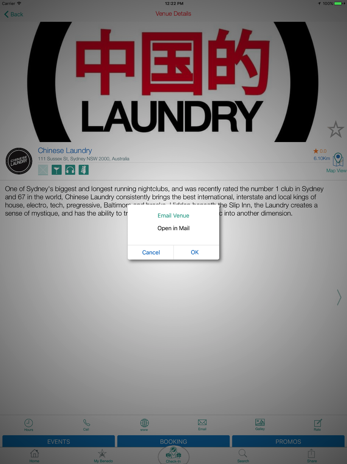 Email You also can email to venue owners your opinion or plan with them a new event. Ipad HELP Ipad Step 1 On venue details tap on Email button at bottom Step 2 Benedo will ask you to open Mail APP, if you are ok with this you will redirect to compose view so can easily email to venue owners