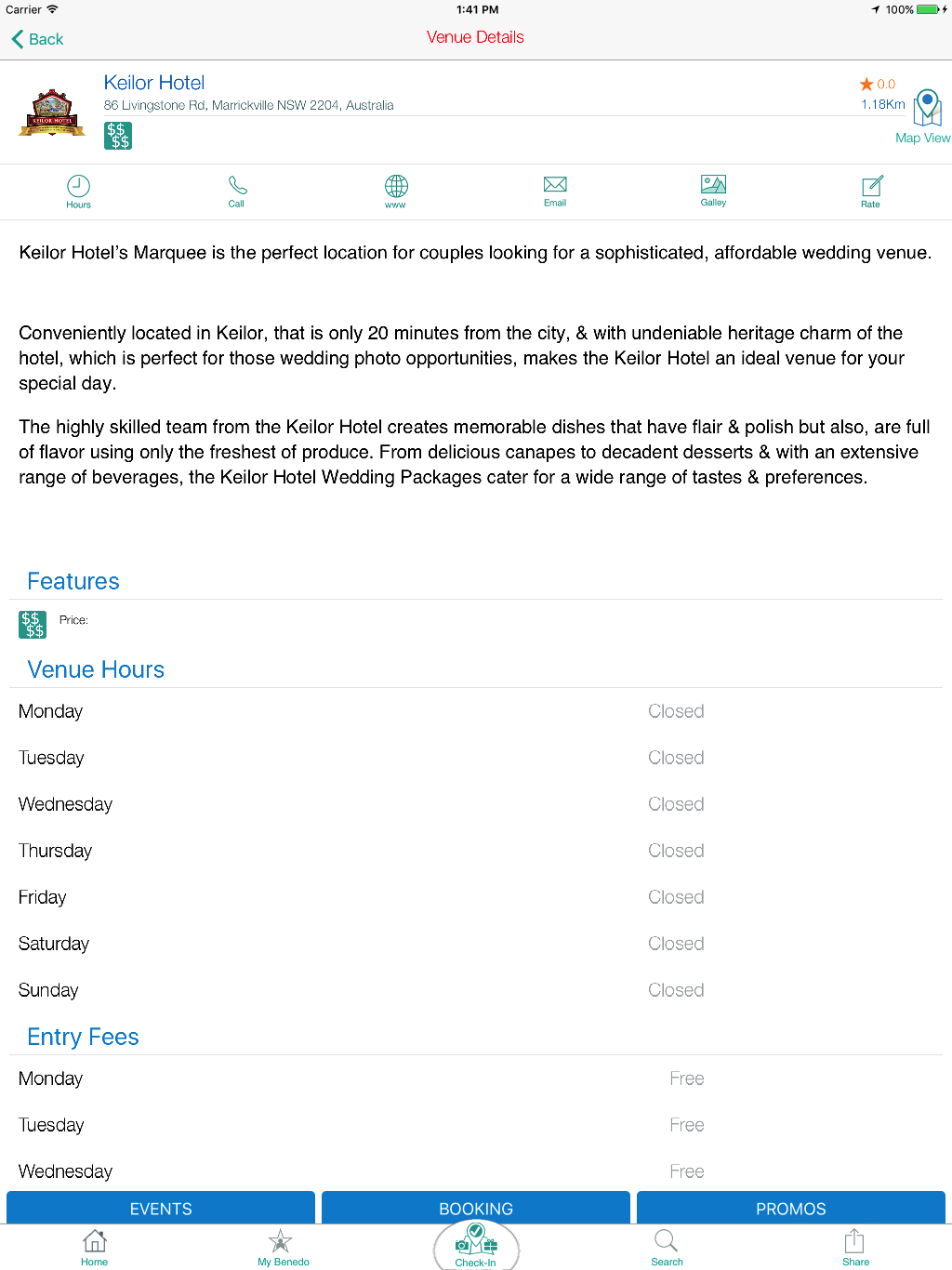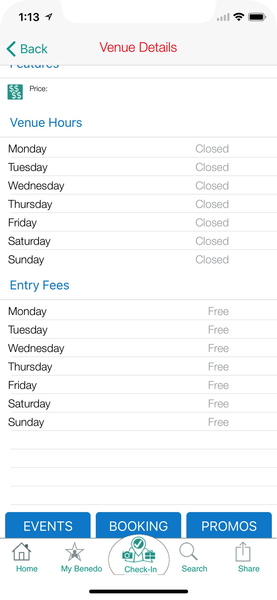 Entry fees In Venues you have to pay some entry fees, you can check in app how much is this fee. Iphone HELP Ipad HELP Iphone Step 1 In Venue Details tap on rigth arrow to display more details Step 2 Scroll down until you see Entry Fees Step 3 Here you can check for days of the week how much you have to pay to gain access to venue Ipad Step 1 In Venue Details tap on rigth arrow to display more details Step 2 Here you can check for days of the week how much you have to pay to gain access to venue